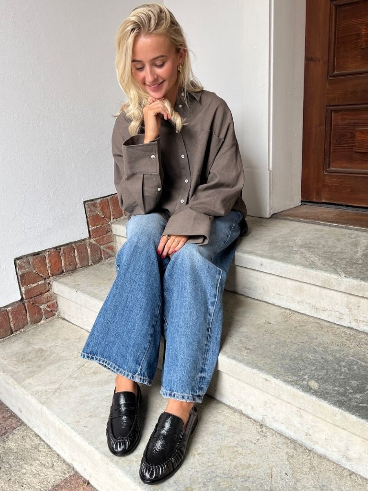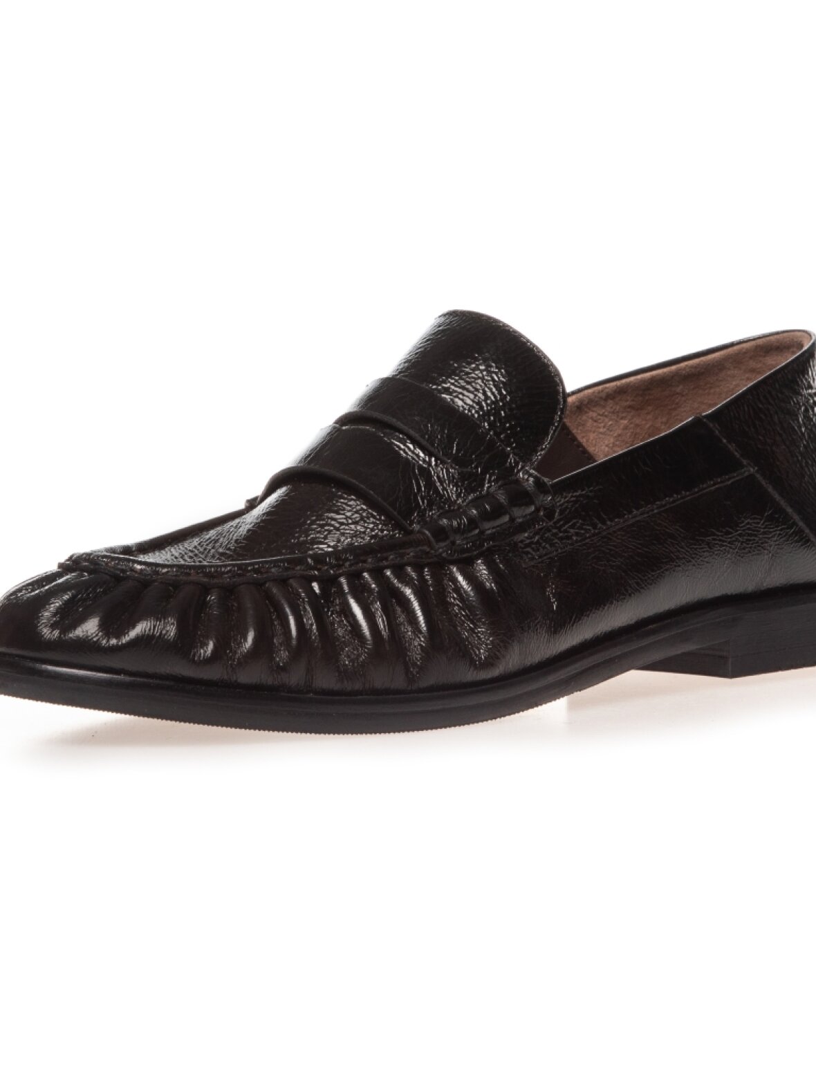 En stilfuld loafer med karakter fra Copenhagen Shoes – lavet i blødt sort skind med markante rynkede detaljer foran, som giver skoen et eksklusivt og raffineret look. Den brede penny-strap tilføjer et klassisk præg til den ellers moderne silhuet.