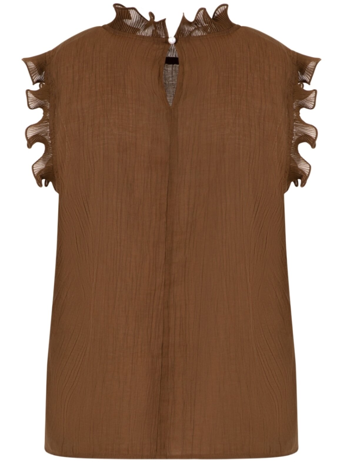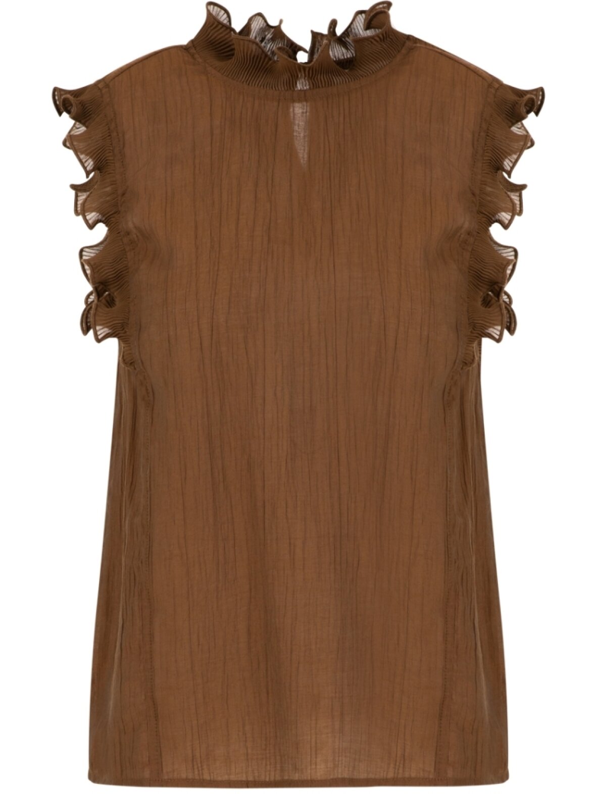 Toppen fås i størrelserne 36 til 44, så der er en størrelse til enhver kropstype. Den er lavet af kvalitetsmaterialer, der sikrer en behagelig pasform hele dagen. Takket være den tidløse brune farve kan den nemt styles med både jeans, nederdele og shorts, hvilket gør den til en alsidig tilføjelse til din garderobe.