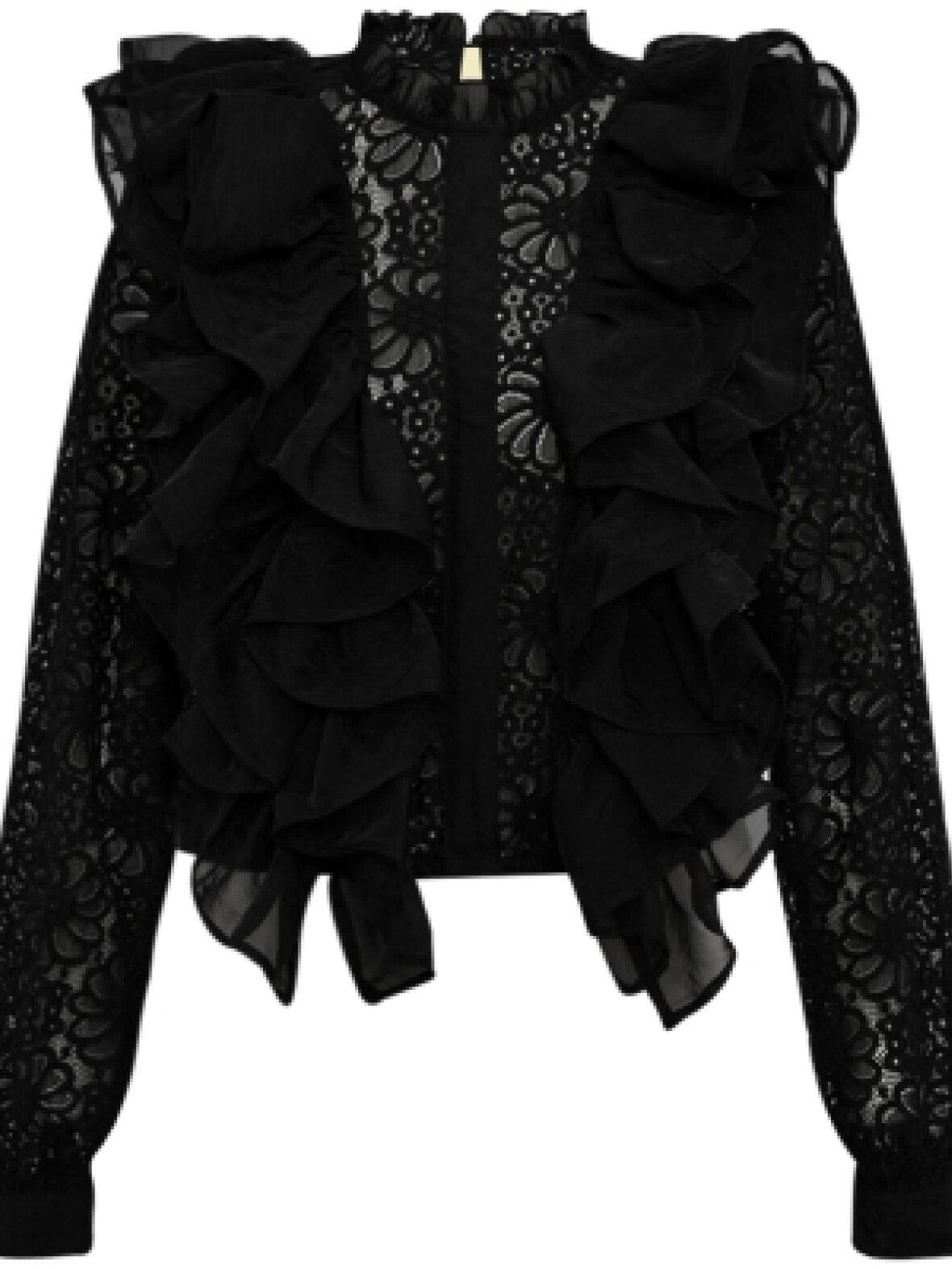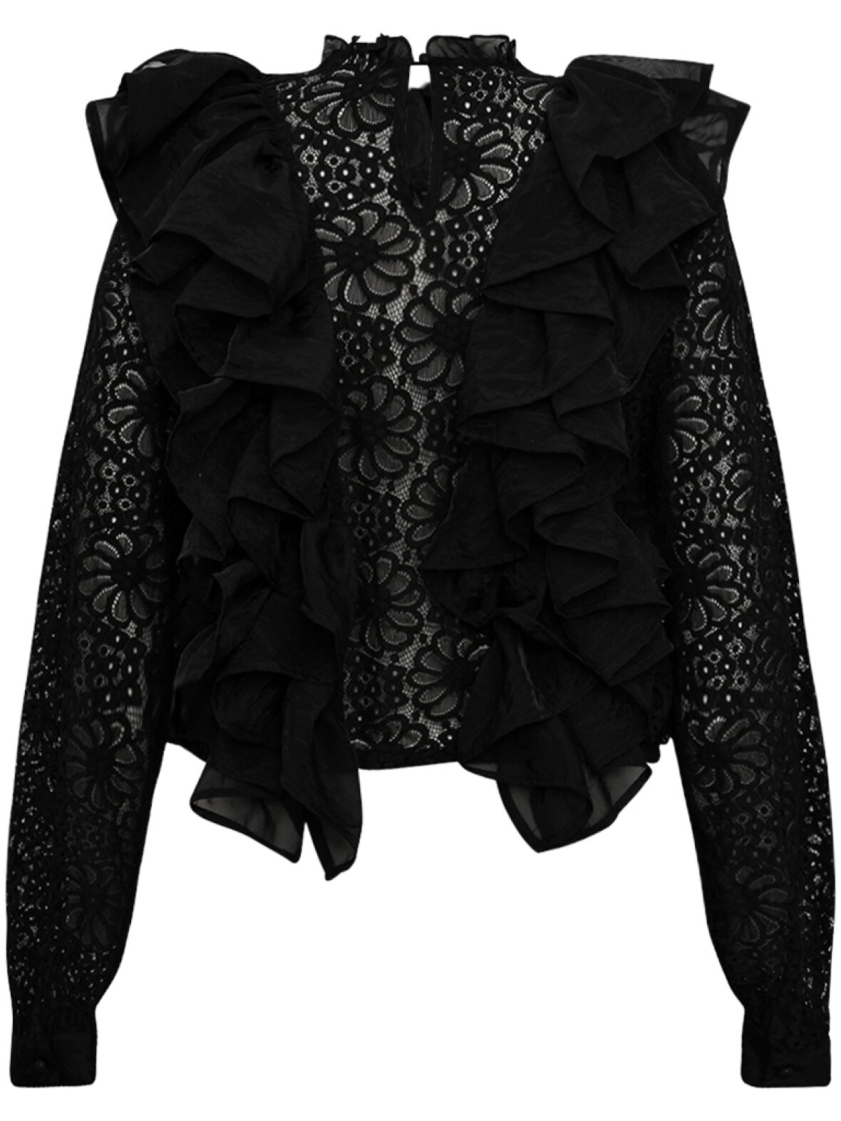 En virkelig iøjnefaldende bluse i smuk blondemetervare, prydet med store, pompøse flæser, der skaber et raffineret og dramatisk udtryk. Ærmerne har let puf og fylde, afsluttet med en fin manchetlukning for et elegant finish. En bluse, der skal opleves!