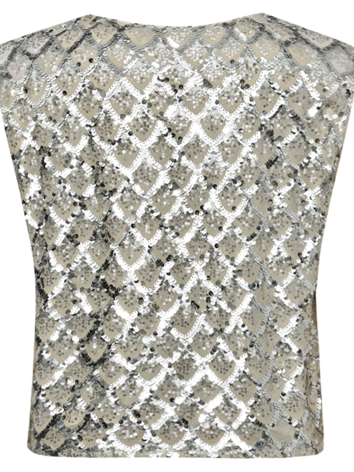 Skøn paillettop med et smukt mønster og fine skulderpuder, der giver et delikat og sofistikeret udtryk. Perfekt til at løfte ethvert outfit og tilføje et strejf af glamour til både hverdag og fest.