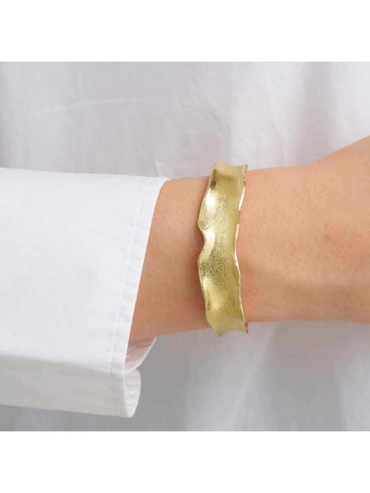 Den er lavet af kvalitetsmaterialer, der sikrer holdbarhed og komfort, mens den gyldne belægning giver et luksuriøst udseende. Uanset om du skal på arbejde, til brunch med vennerne, eller til en aften i byen, vil denne bangle helt sikkert tiltrække opmærksomhed og komplimenter.
