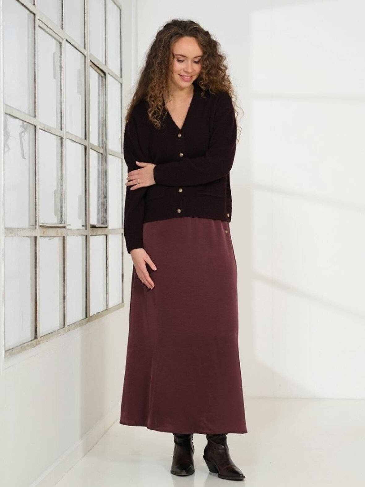Cardiganen har to påsyede lommer, lukkes med fem fine guldknapper foran og har ribafslutninger på ærmer og i bunden.