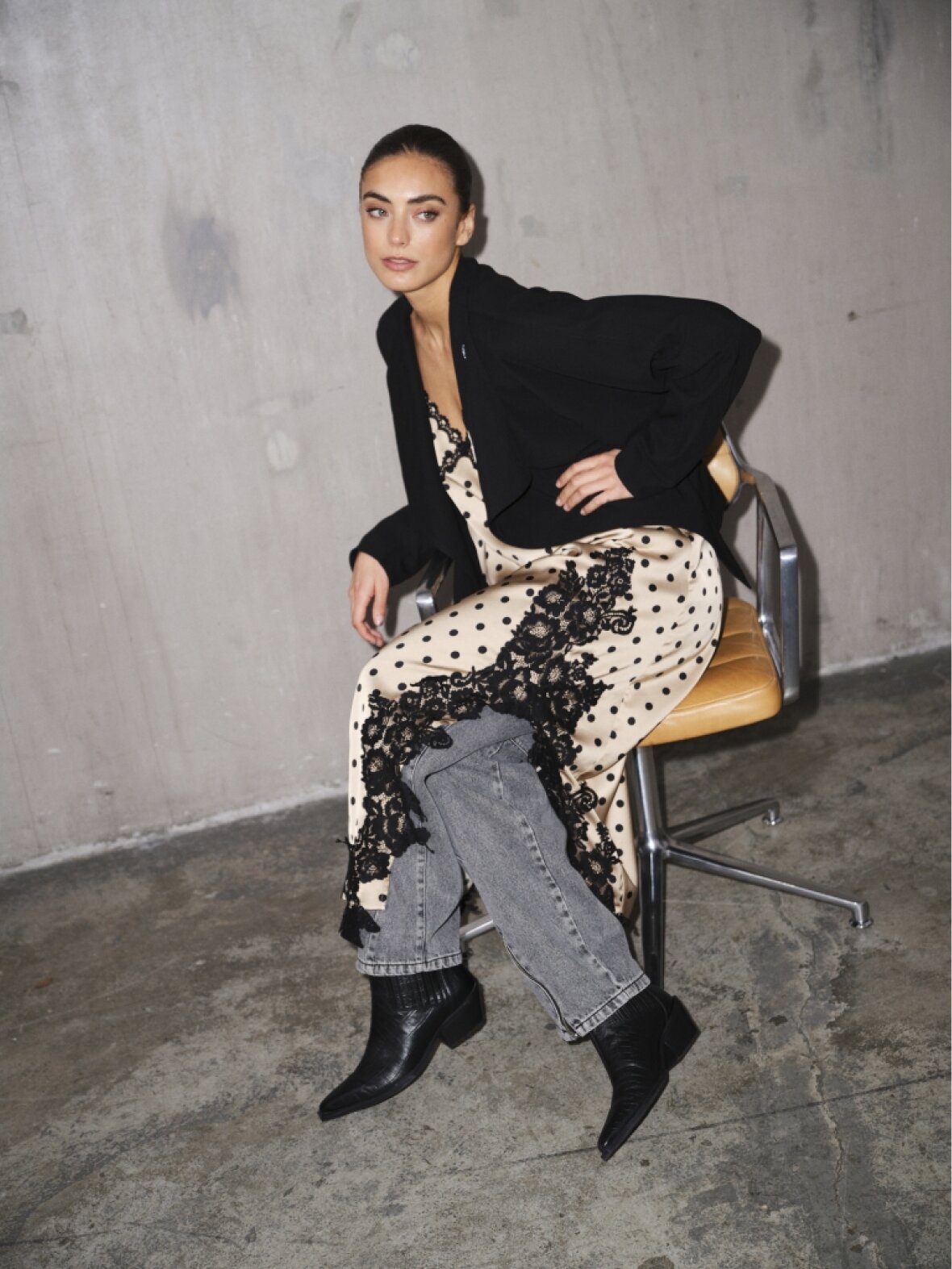 Oplev den perfekte kombination af stil og komfort med DahliaGO Mi Dress Latte black fra det elskede mærke Gossia. Denne smukke kjole er en ny tilføjelse til vores kollektion og er designet til den moderne kvinde. Med sit unikke latte black dots mønster tilføjer kjolen et elegant touch til enhver garderobe.