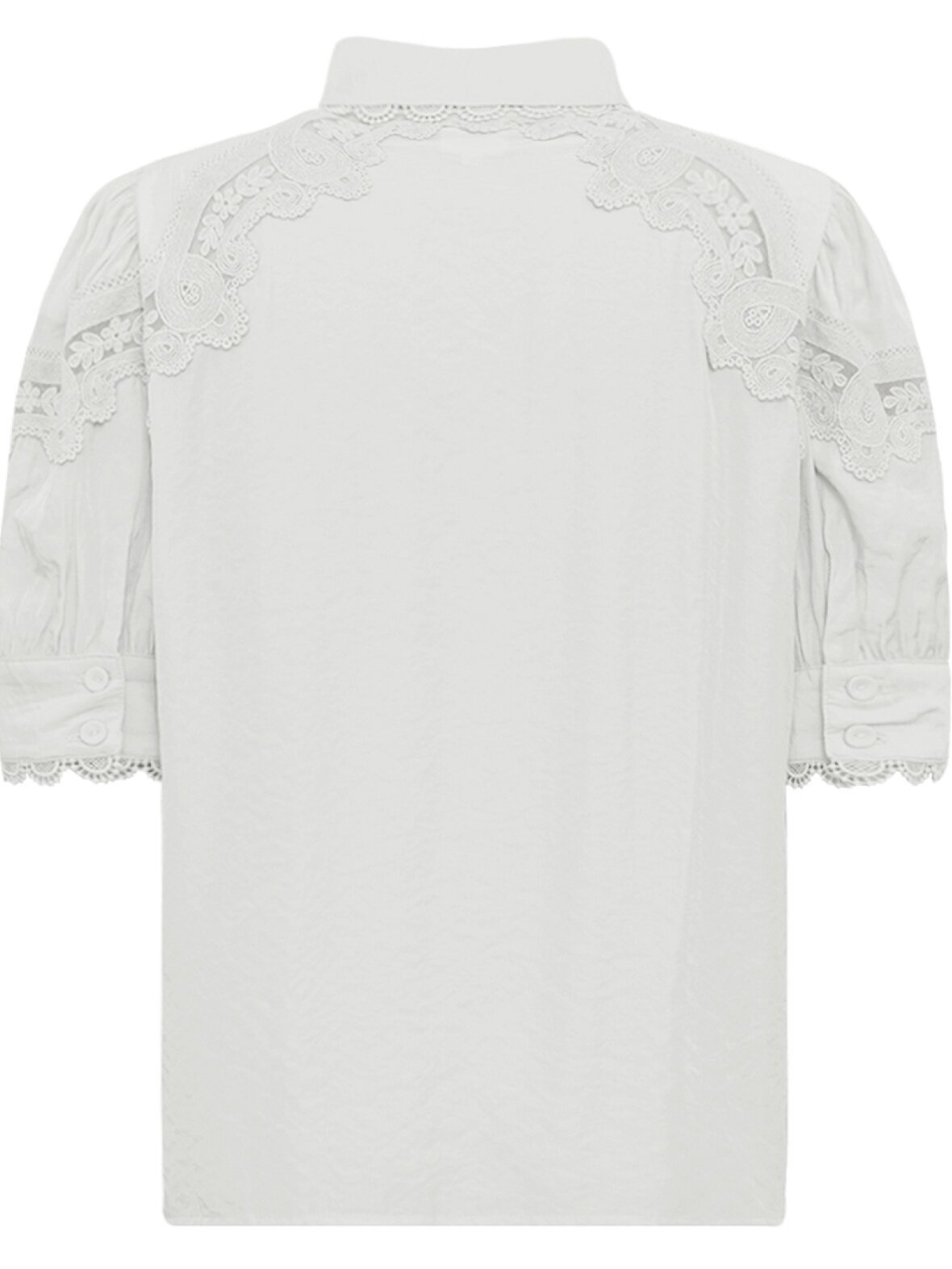 CornaGO Shirt er en let og elegant skjortebluse med korte pufærmer og mange fine blondedetaljer, der giver et feminint og sofistikeret look.
