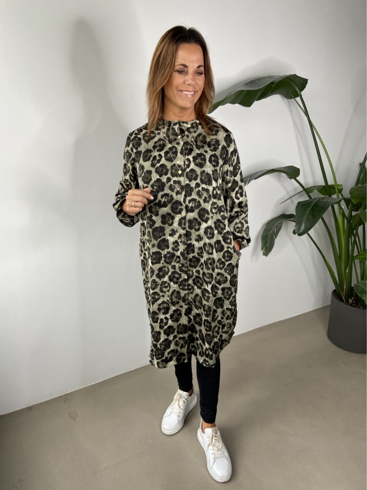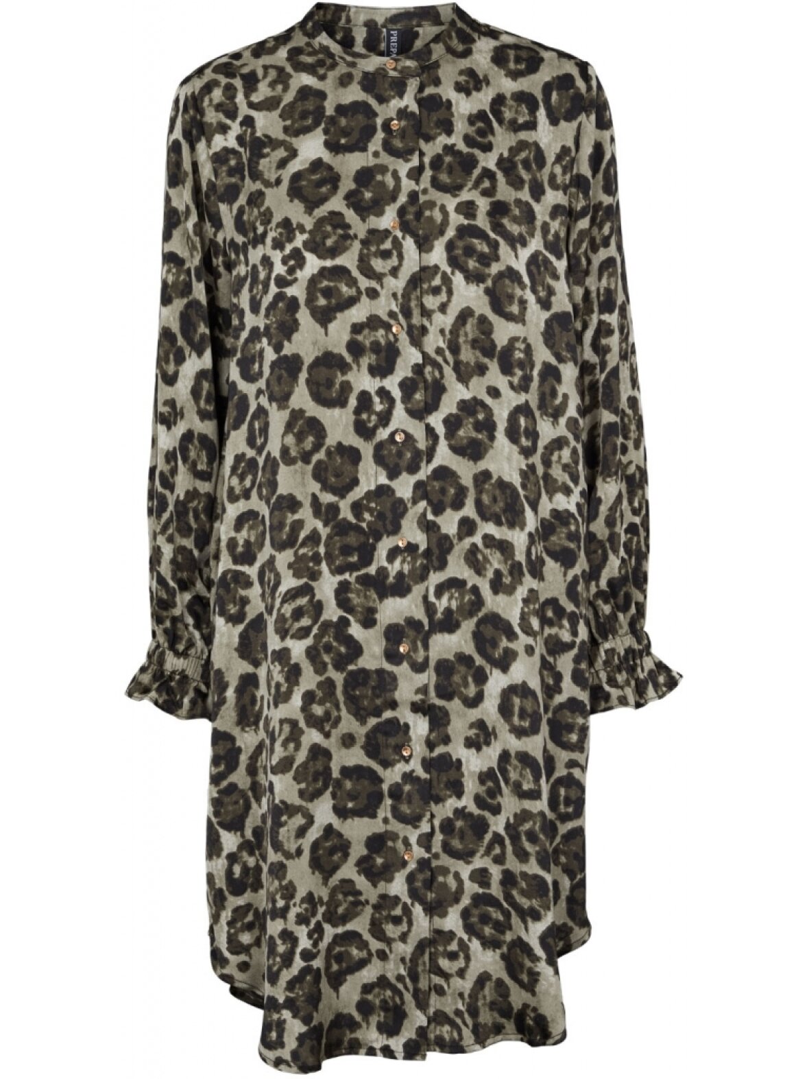 Victoria Dress i et fint storblomstret print i grønne farver. Kjolen har lille kina krave, knapper hele vejen ned foran og lange ærmer med smock.