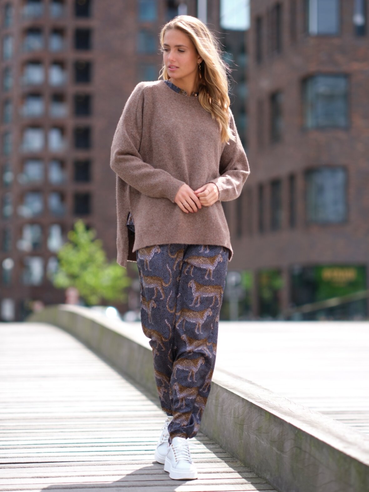 Ayoe Pants fra Prepair i et smukt satin dyreprint med leoparder på.