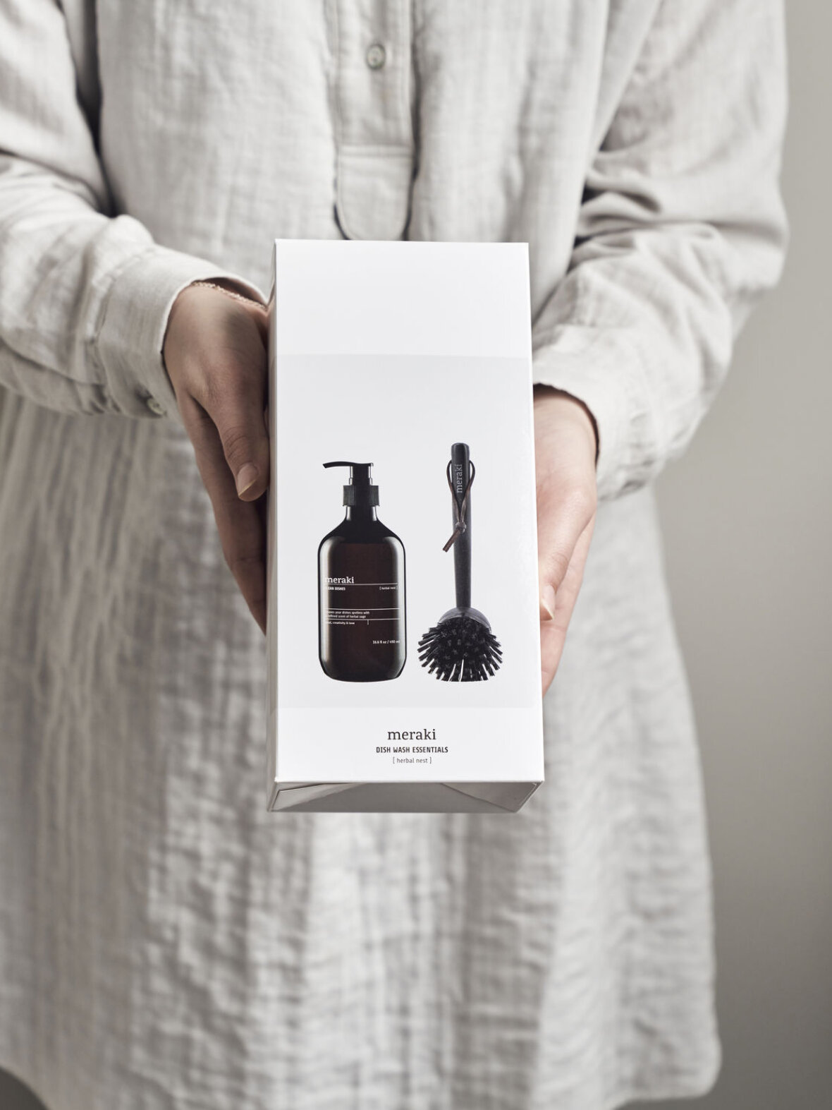 Denne gaveæske fra Meraki består af essentielle ting til dit køkken: Et opvaskemiddel og en opvaskebørste i træ. Opvaskemidlet hedder Herbal Nest og er Svanemærket. Det har en let og naturlig urteduft med noter af salvie, citrus og moskus. Opvaskebørsten er lavet af bambus med en sort plet, der lader træets årer skinne igennem. Skaftet giver dig et behageligt greb, mens selve børsten er udskiftelig for at forlænge opvaskebørstens levetid. Denne gaveæske er perfekt til selvforkælelse eller som en skøn gave til én, du har kær.