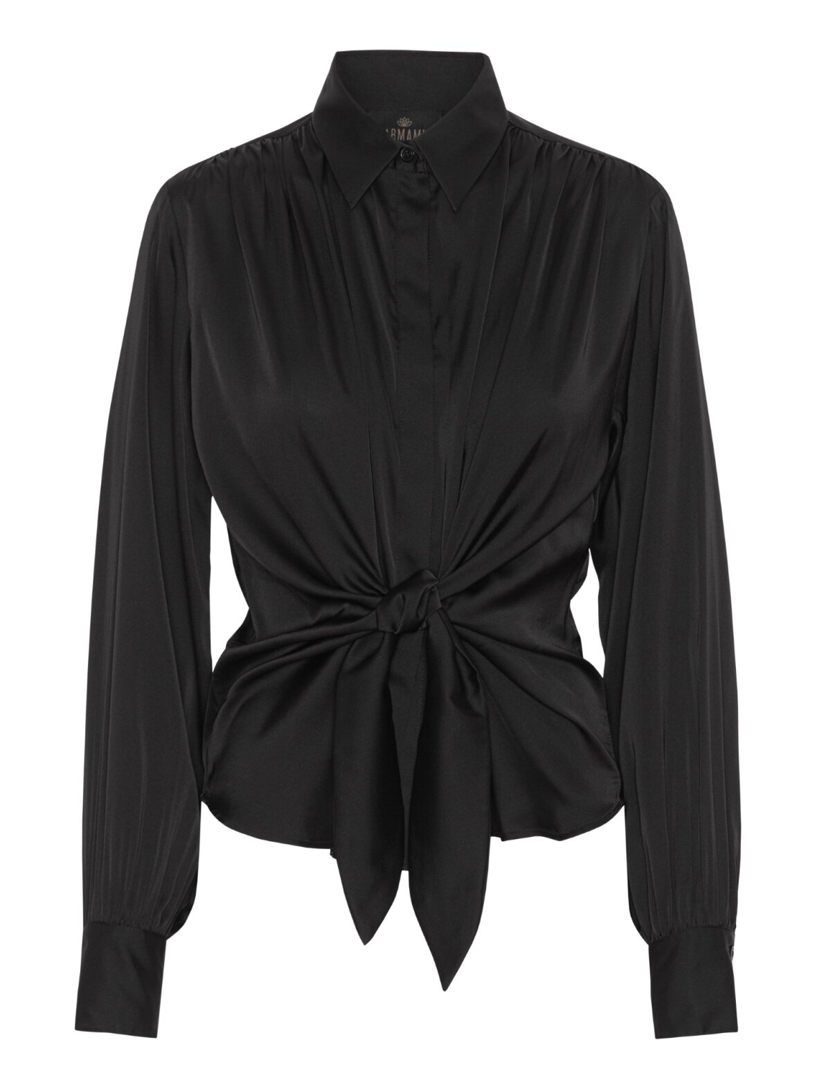 Skjorten er med krave, lange ærmer og en bindedetalje foran som fremhæver taljen.