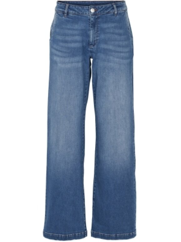 Malia Jeans fra Prepair er en super lækker jeans med vidde i en lysere vask. Bukserne har to sidelommer og pynte lommer bagpå. Bukserne er med lynlås og en enkelt knap.